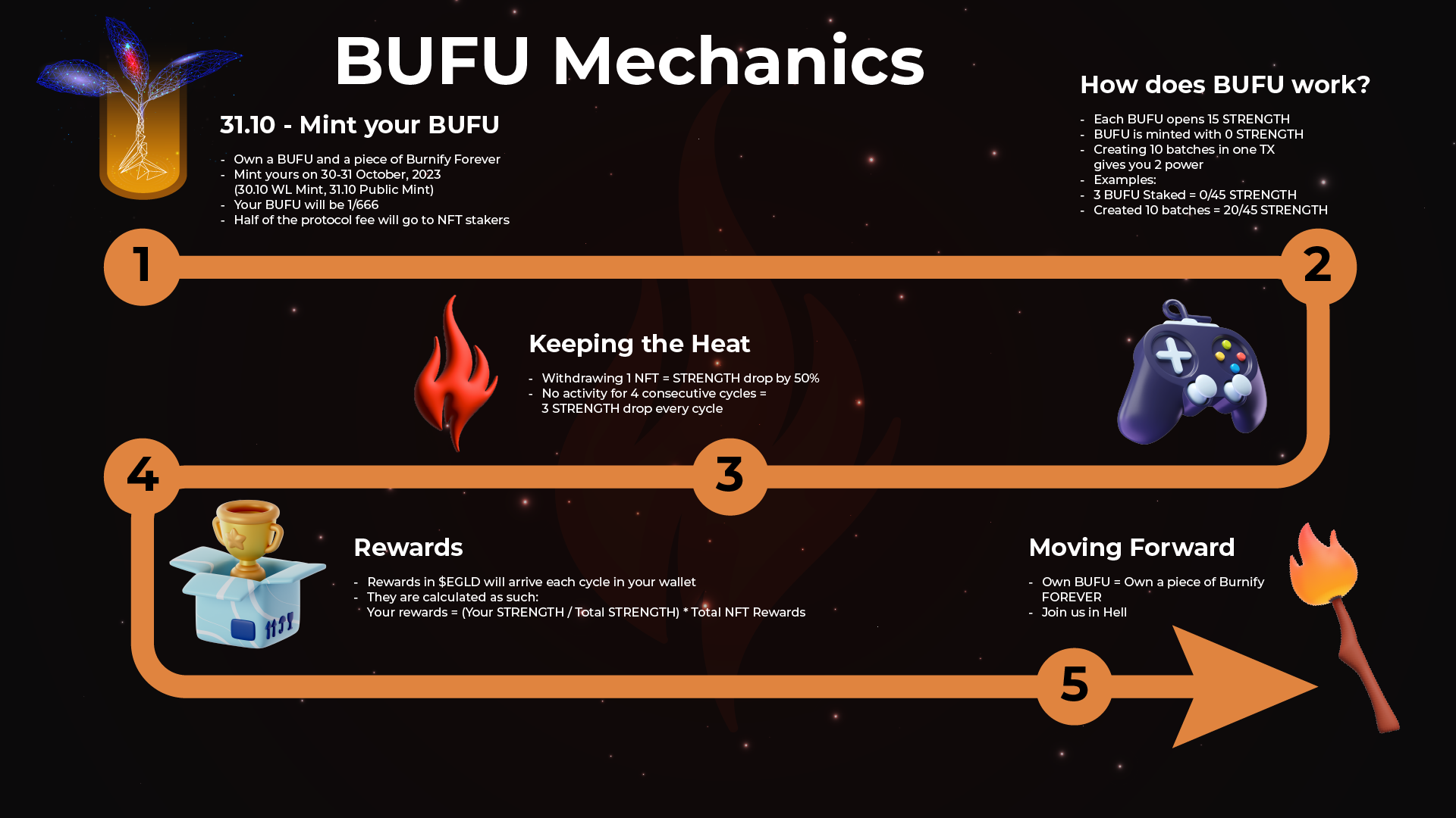 The BUFU NFT collection would serve as an additional reward mechanism within Burnify.App. It's designed so that 50% of the Burnify protocol fee would be directed towards this collection.